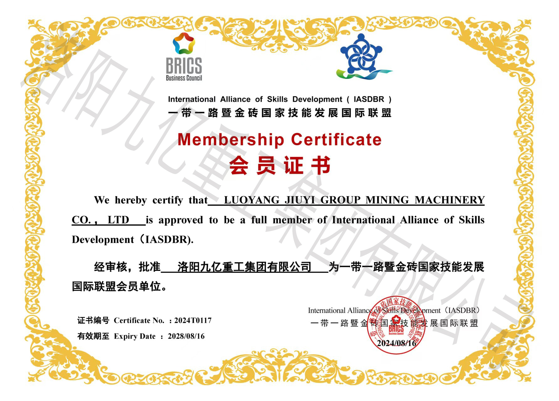 一帶一路暨金磚國家技能發(fā)展國際聯(lián)盟會(huì)員證書